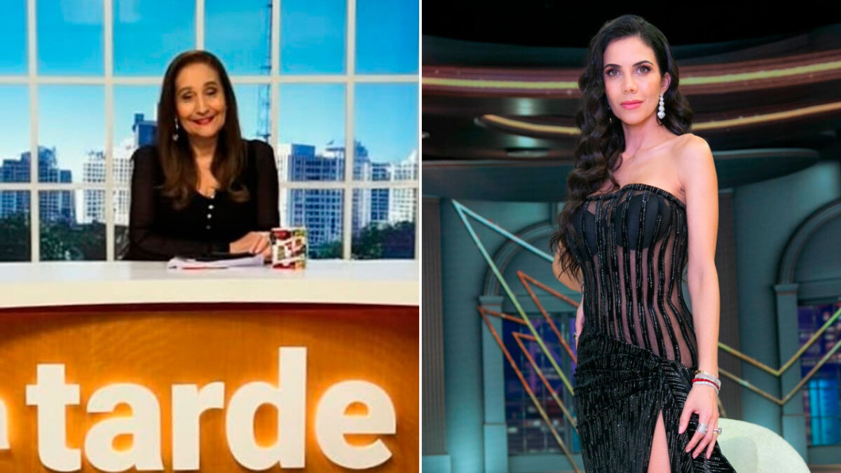 Sonia Abrão na bancada do A Tarde é Sua e Daniela Albuquerque de vestido preto transparente em montagem lado a lado com cenários da RedeTV! ao fundo