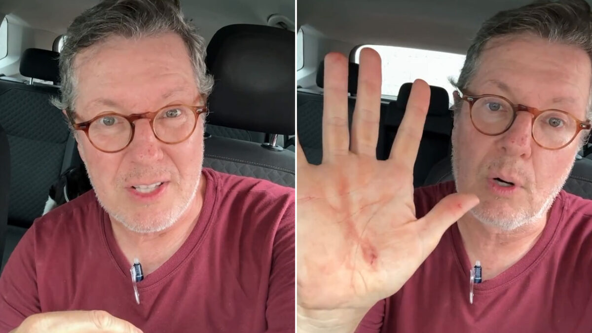 Montagem com fotos do vídeo em que Márcio Gomes mostra ferimento na mão durante tentativa de assalto em São Paulo