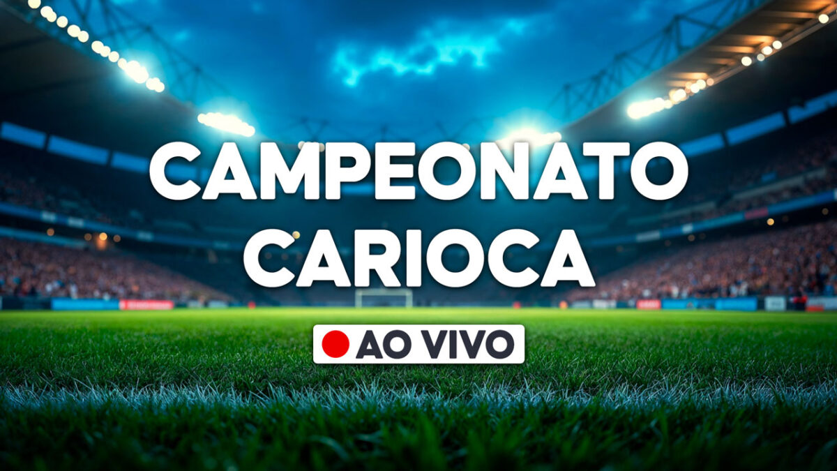 Gráfico com a frase Campeonato Carioca e selo ao vivo sobre imagem de estádio de futebol iluminado com gramado em destaque