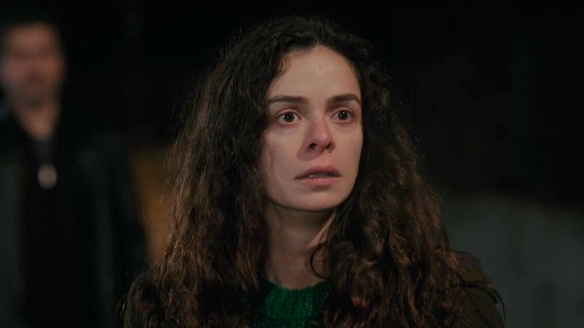 Atriz Özge Özpirinçci como Bahar em cena tensa de Força de Mulher, com expressão assustada e olhos marejados, usando suéter verde, enquanto um homem desfocado aparece ao fundo