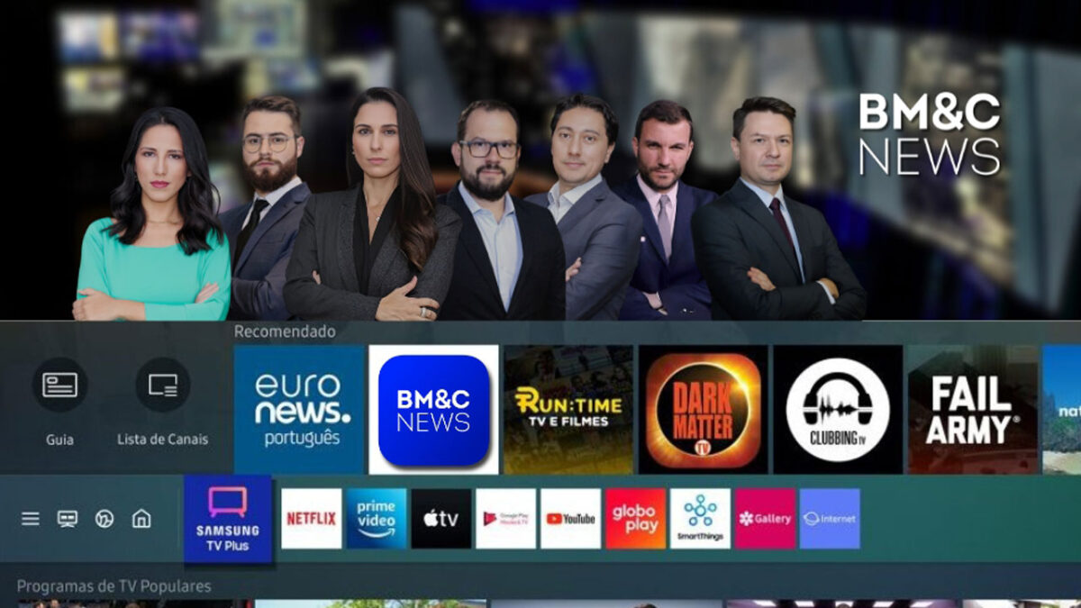Clientes com smart TVs da Samsung terão acesso à programação da BM&C News, único canal da TV brasileira voltado exclusivamente para investimentos e negócios. A inclusão do canal na plataforma Samsung TV Plus permite que cerca de 10 milhões de usuários ativos no Brasil acompanhem o conteúdo sem necessidade de assinatura ou pagamento.