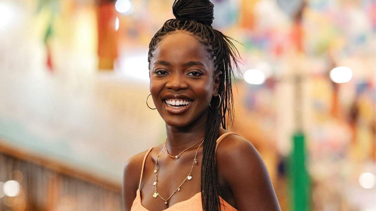 Clara Moneke caracterizada como Leona, personagem principal da novela Dona de Mim, sorrindo em um ambiente iluminado e colorido