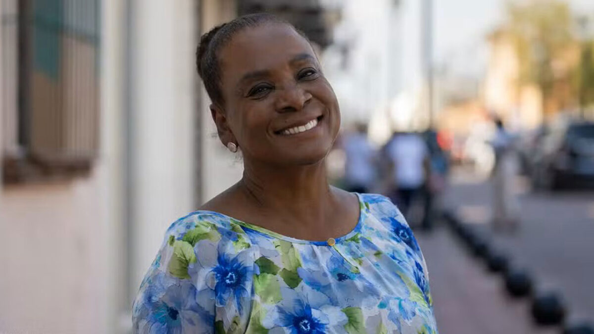 Dulcineia Novaes sorrindo com blusa estampada de flores azuis em rua ao ar livre