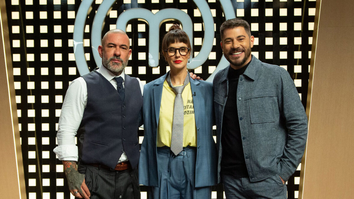Henrique Fogaça, Helena Rizzo e Evaristo Costa posam juntos no estúdio do MasterChef com logo ao fundo
