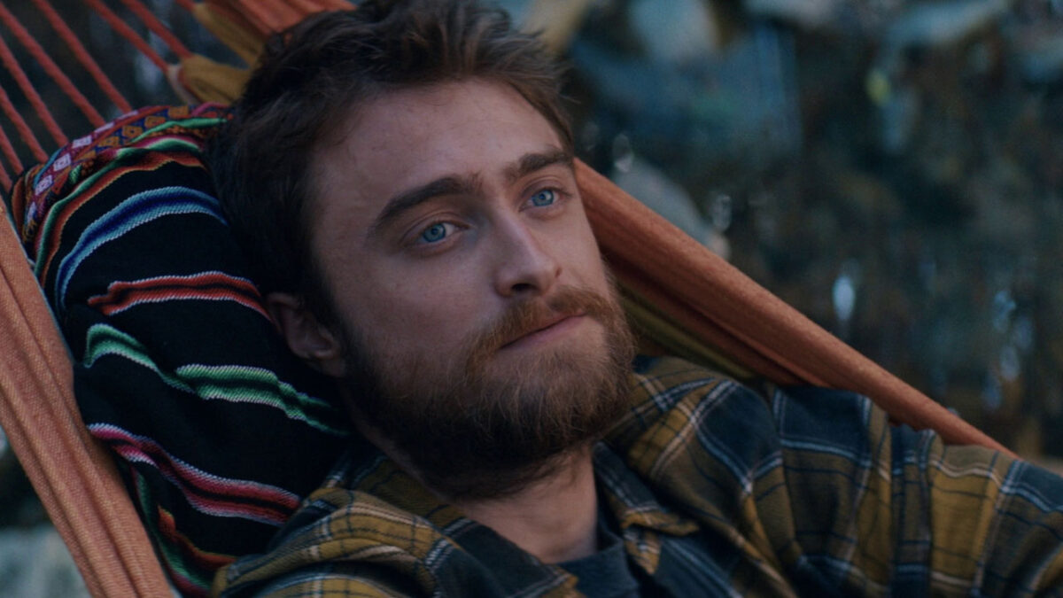 Yossi Ghinsberg (Daniel Radcliffe) com barba e camisa xadrez amarela deitado em uma rede colorida em cena do filme Na Selva