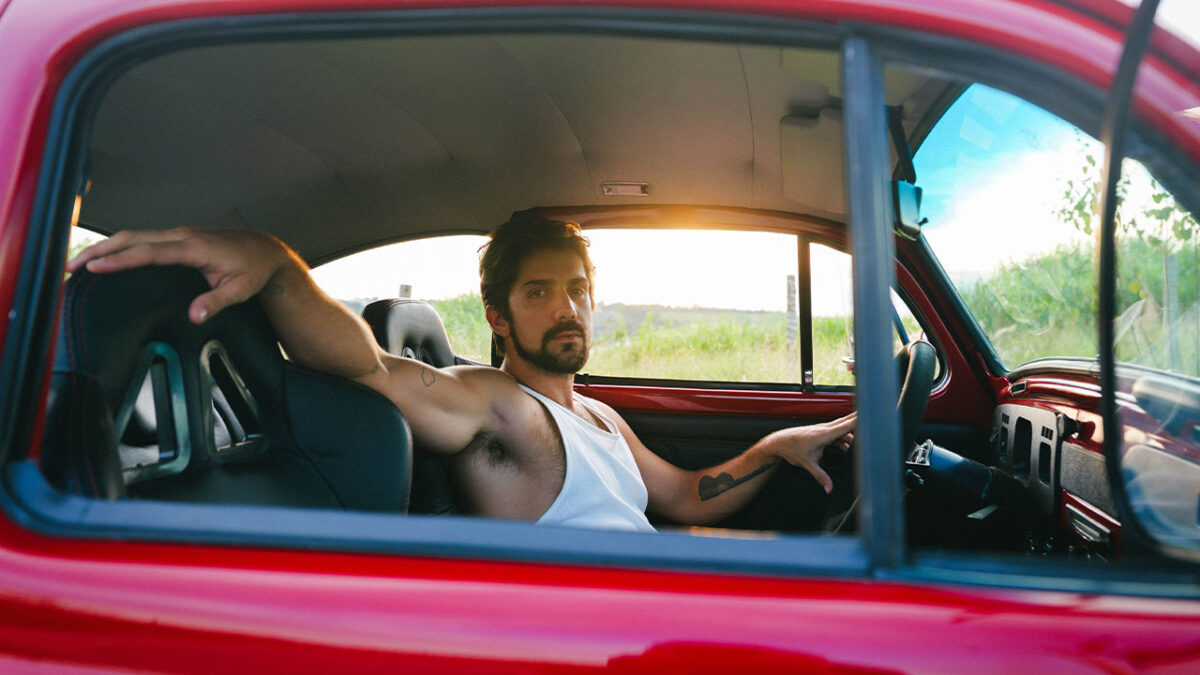 Gabriel Gonti sentado no banco do motorista de um carro antigo vermelho com o braço esquerdo apoiado no encosto do banco
