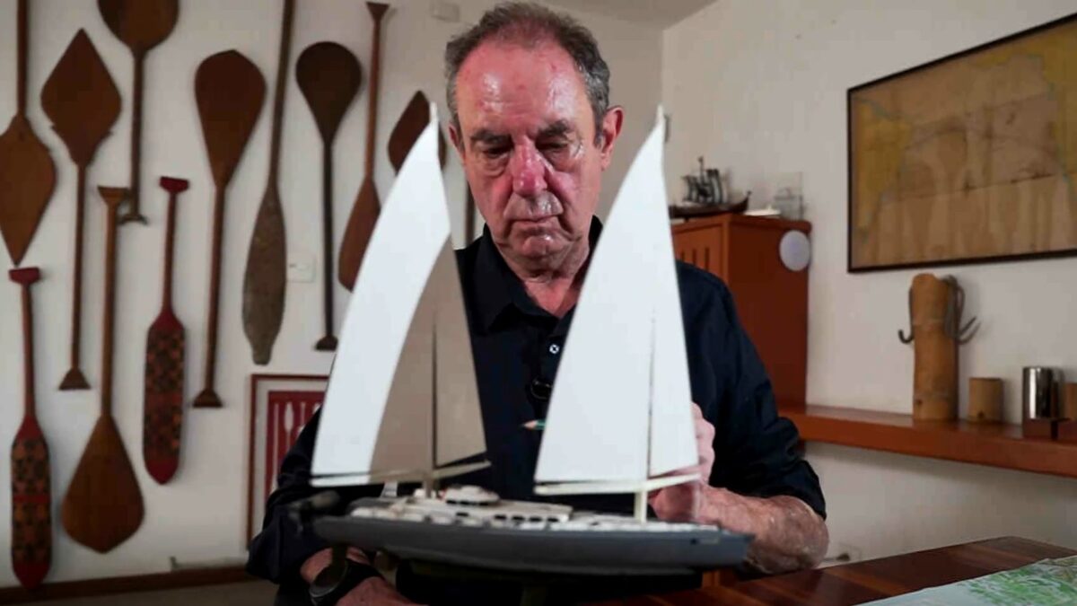 Amir Klink segura maquete de veleiro sobre mesa em ambiente interno com remos decorativos na parede ao fundo
