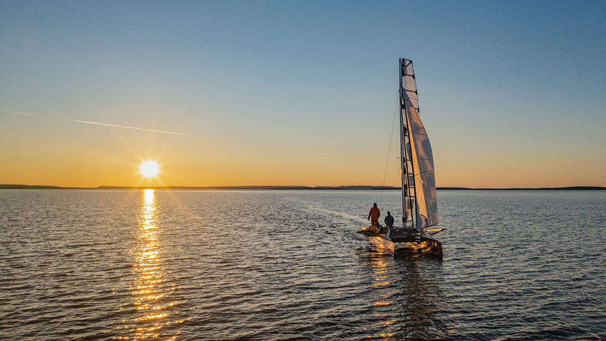 Beto Pandiani e Igor Bely em catamarã navegando ao pôr do sol no documentário Rota Polar