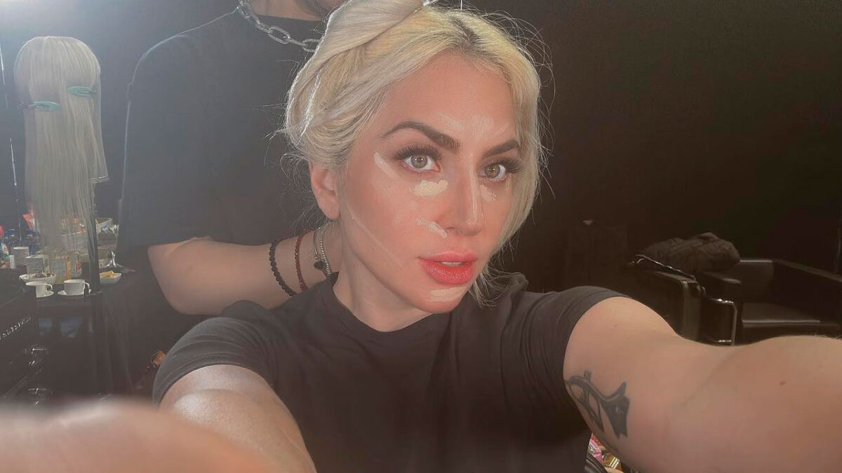 Lady Gaga tira uma selfie durante preparação de maquiagem, com cabelo loiro preso e marcas de contorno no rosto
