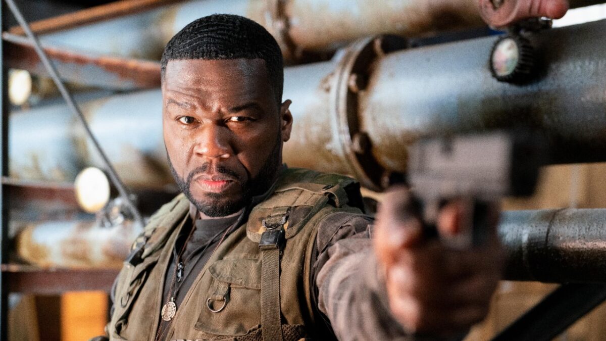 Ator 50 Cent interpreta Easy Day no filme Os Mercenários 4, veste colete tático militar, aponta pistola para frente, possui barba e cabelo curto, tubulações industriais ao fundo