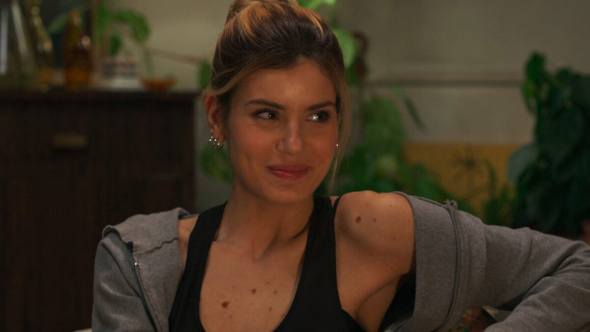 Camila Queiroz em cena de Beleza Fatal, vestindo jaqueta cinza e regata preta, com fundo decorado com plantas