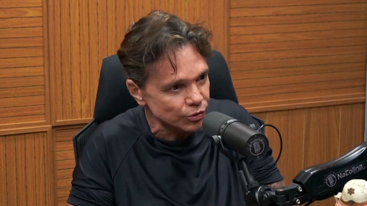 Cantor Netinho fala ao microfone durante participação no podcast Palavra de Brother com parede de madeira ao fundo