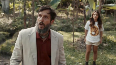 Zuca (Vanessa Giácomo) e Luís Jerônimo (Daniel de Oliveira) em cena romântica da novela Cabocla com um rio ao fundo