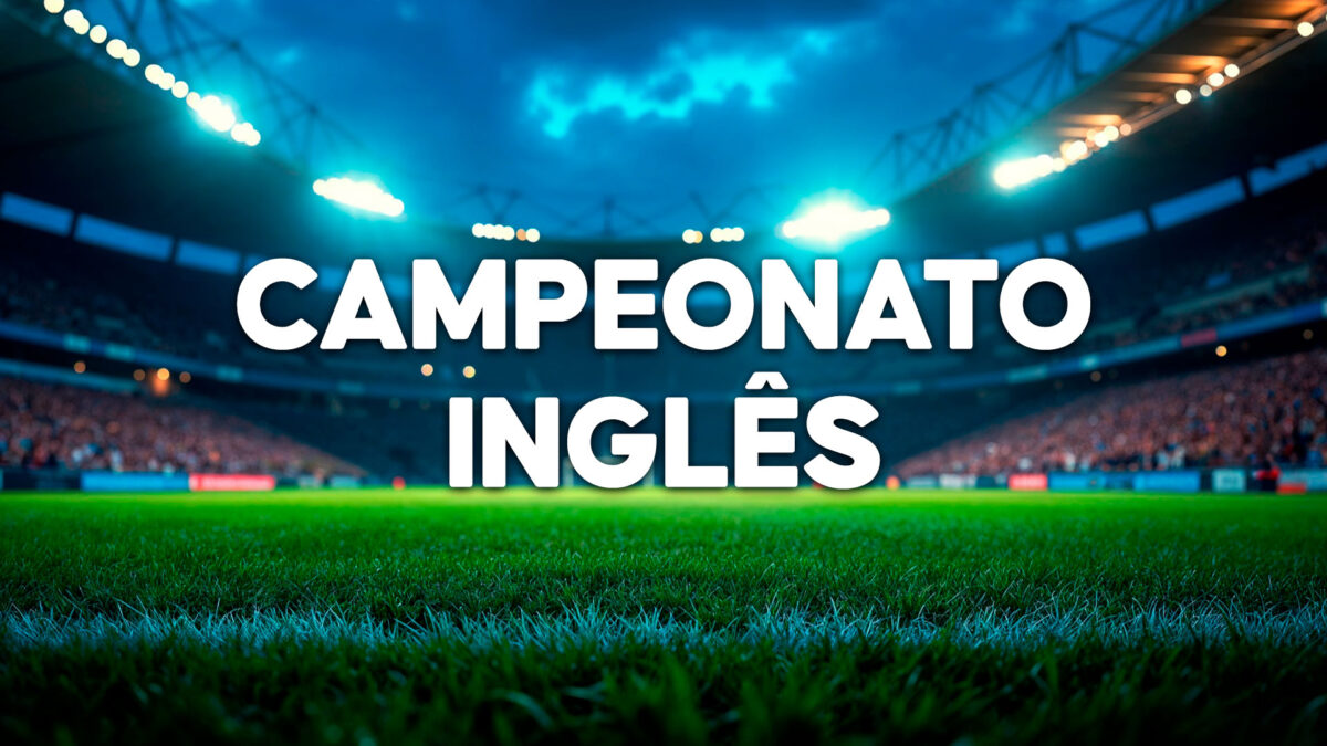 Gramado de estádio de futebol em foco, fundo com arquibancadas lotadas e refletores acesos, texto centralizado escrito Campeonato Inglês em branco