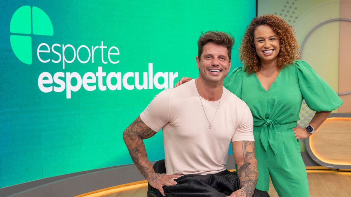 Fernando Fernandes e Karine Alves sorrindo no estúdio do Esporte Espetacular com logo do programa ao fundo