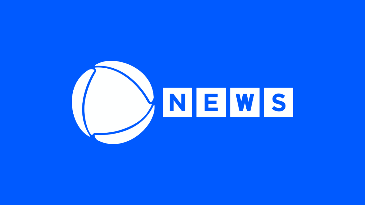 Logotipo da Record News com esfera branca e a palavra NEWS em blocos azuis e brancos em fundo azul sólido