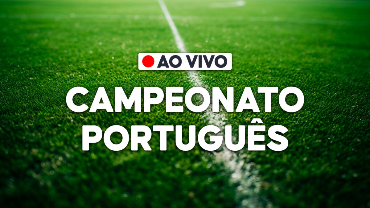Arte digital com o texto Campeonato Português em letras brancas sobre gramado de futebol em foco seletivo, com linha branca de marcação e selo ao vivo
