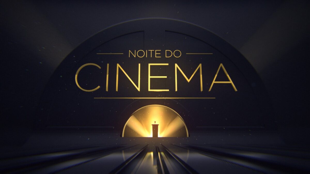 Logotipo Noite do Cinema do SBT com letras douradas em fundo escuro, luz central radiante ao fundo, design elegante sobre linhas de perspectiva metálicas