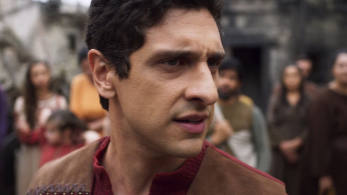 Mario Bregieira na série Neemias olhando para o lado com expressão preocupada, cercado por um grupo de pessoas em um cenário histórico