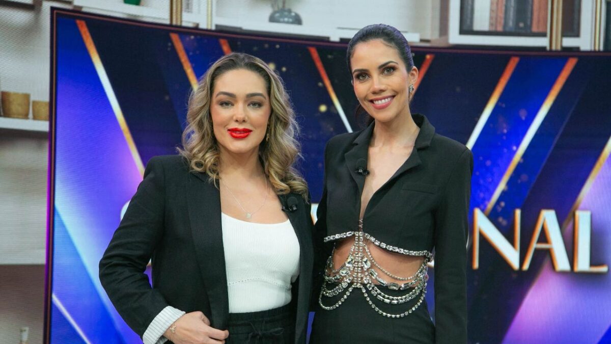 Tania Mara de blazer preto e Daniela Albuquerque com conjunto de alfaiataria vazado e cristais posam sorridentes no cenário do programa Sensacional