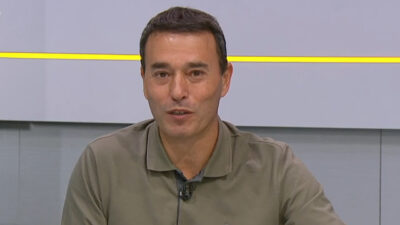 Luis Roberto, que vai narrar Corinthians e Fluminense, com expressão de comemoração