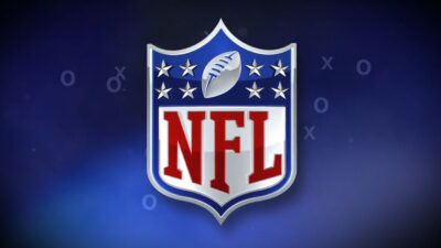 Escudo oficial da NFL em fundo azul com bola de futebol americano e estrelas acima das letras vermelhas NFL