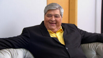 Renato Aragão sorri enquanto posa para foto em frente a uma estante com livros e objetos decorativos na série Tributo, da Globo