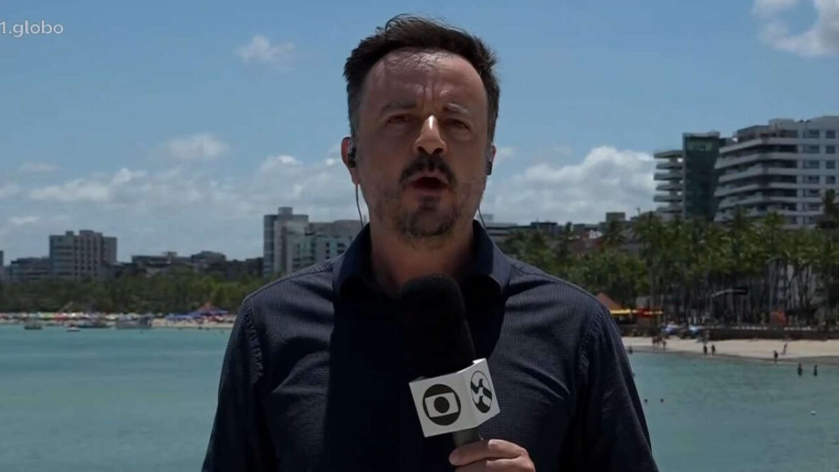 Jornalista Mauro Wedekin segura microfone da TV Globo e faz entrada ao vivo em praia urbana de Maceió com prédios ao fundo