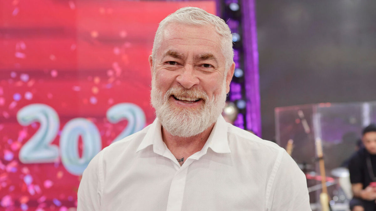 Alex Atala sorri no palco do programa Mais Você, durante a comemoração dos 25 anos da atração, com decoração festiva ao fundo