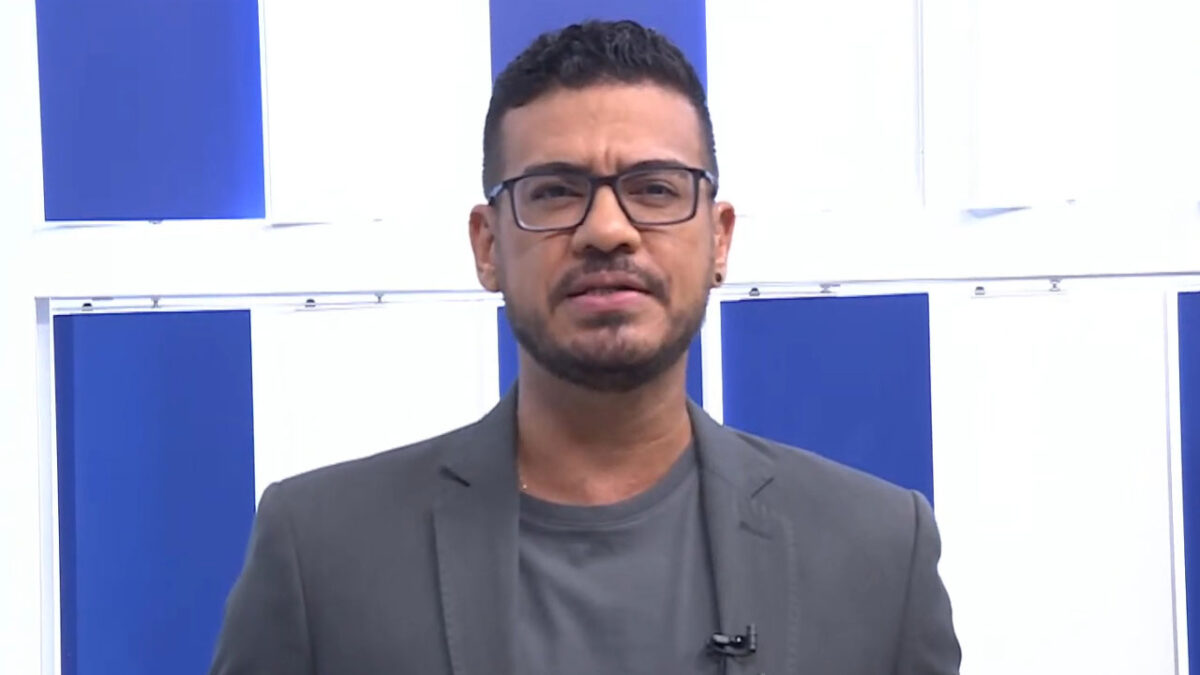 Jhonatã Gabriel em frente a painel azul e branco durante apresentação do TVE Notícias na TVE Bahia