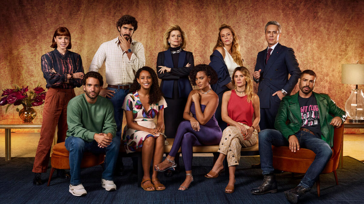 Elenco do remake de Vale Tudo posando para foto oficial, com atores distribuídos entre posições sentadas e em pé, em um cenário sofisticado com tons dourados e avermelhados