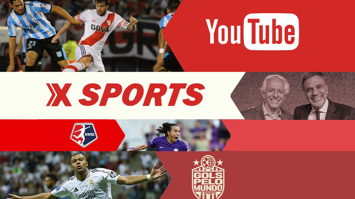 Logo do canal X Sports com imagens de jogos de futebol masculino e feminino e a marca do YouTube ao lado